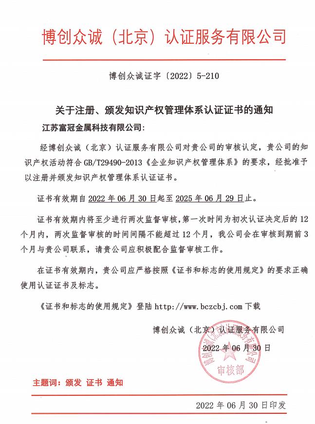 知識產(chǎn)權(quán)管理體系認(rèn)證證書